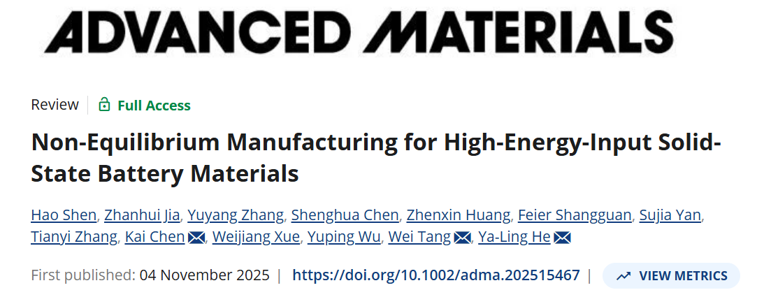 西安交大科研团队在非平衡制造拓展全固态电池材料的结构与性能边界领域取得新突破,相关论文《高能量输入固态电池材料的非平衡制造机制》发表于国际权威期刊《先进材料》。西安交通大学材料学院的沈昊副教授、博士生贾占辉和硕士生张昱扬为共同第一作者,材料学院陈凯教授(民进会员)、化工学院唐伟教授为共同通讯作者。